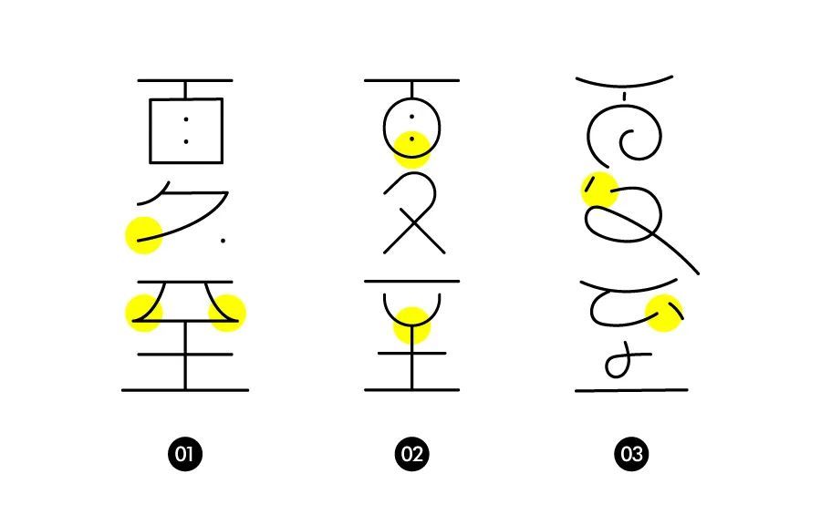 在今天的几组案例实操字形中,我们设定的规则有三个,一是由字意出发或者发散结合得到灵感;二是由基础点、线、面三者进行结合,具有一定的变化节奏;三是秩序,尽可能让整体字形以对称或者对齐化的方式呈现。(这个规则通常是由第一个字形确认得到,这边为了教程便于理解,所以提前说明)